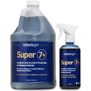 Super 7+ Navel Dip is an umbilical cord dry-out and protective solution for newborn animals. Super 7+ Navel Dip is formulated with ingredients that are safe for animals and the environment. This effective and completely safe formula has been developed strictly for the purpose of animal umbilical cord dry-out and protection and is proven to dry down the umbilical up to 30% faster than the competition.